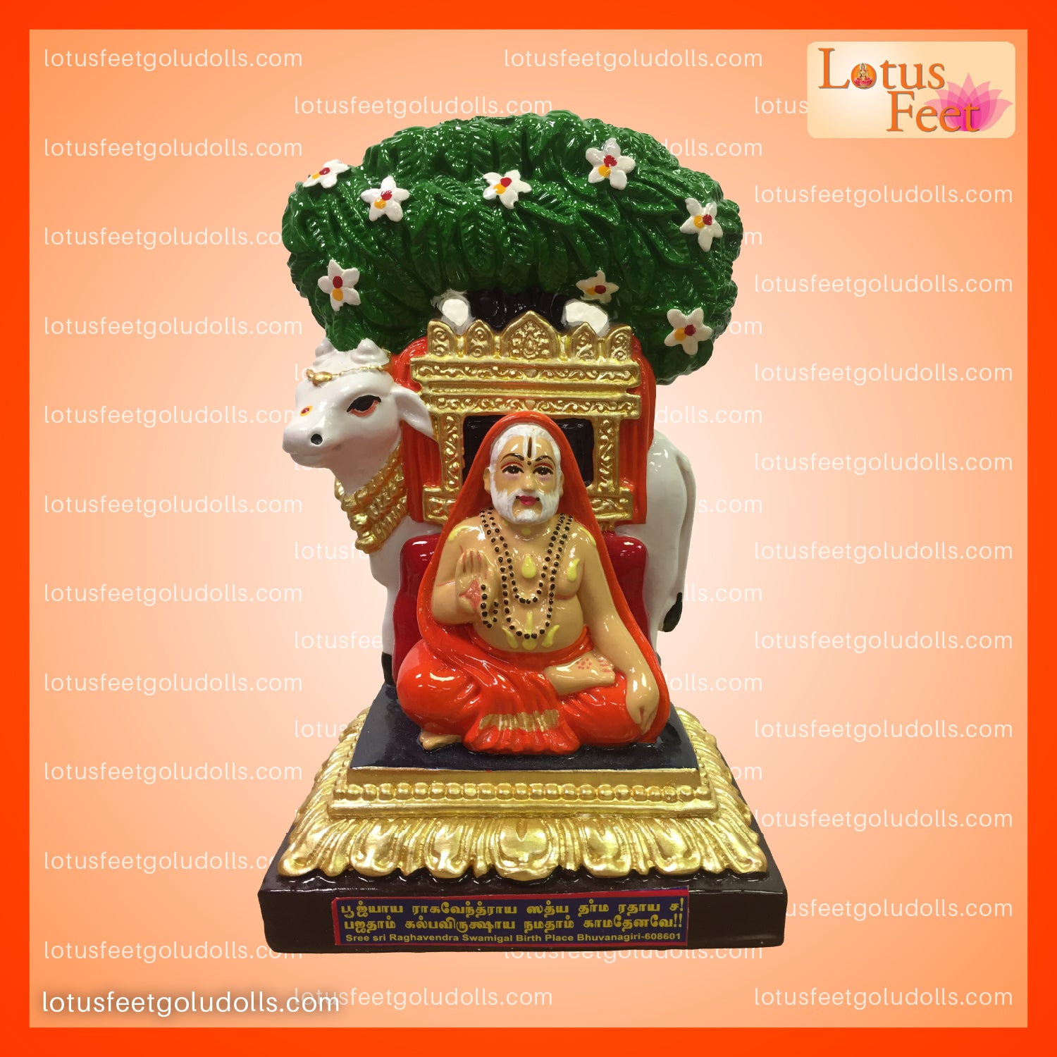Bring home blessings with this vibrant 9" idol of Sri Raghavendra Swami seated under the sacred tree, accompanied by the divine Kamadhenu. Crafted in plaster of Paris with a radiant finish, this doll adds spiritual charm to your Golu or pooja space. Comes in a beautifully packed gift box at no extra cost - perfect for gifting to loved ones or as a cherished keepsake for any Raghavendra devotee!